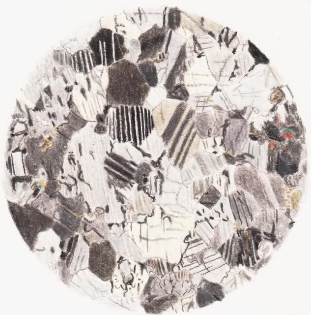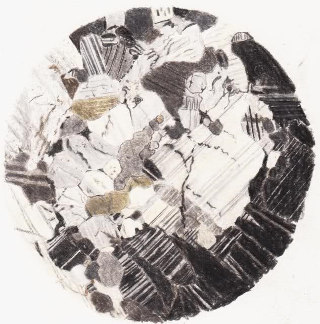 Auf den Bildern sieht man fast nur schwarze, graue und weiße Linien und Flächen, das sind verzwillingte Kalknatronfeldspatkristalle.