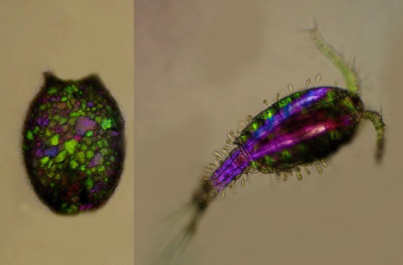 Doppelbrechend sind hier die zum Bau der Amöbenschale verwendeten Sandkörnchen und die Muskelstränge des Hüpferlings, nicht aber seine kleinen Aufsitzer.