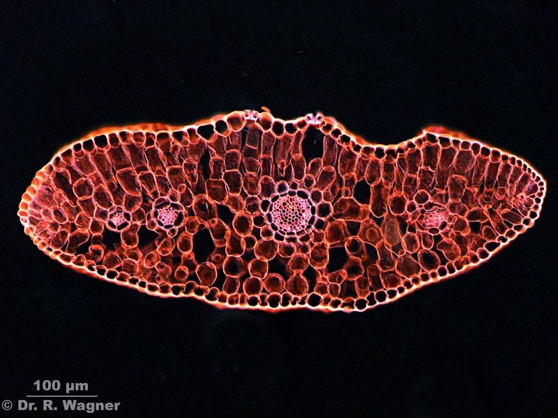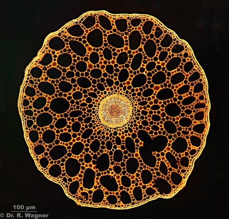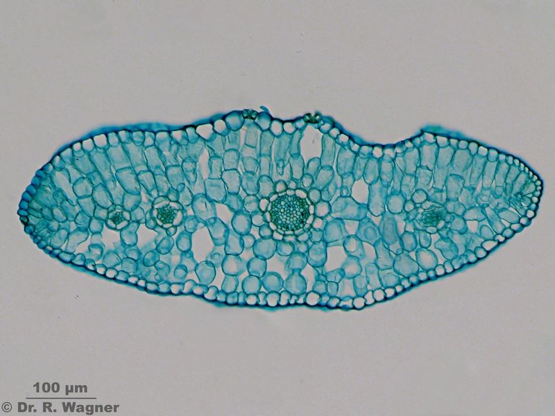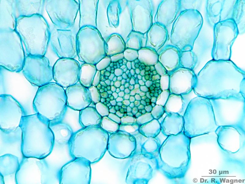 Der Tannenwedel kam auch auf unserem letzten Kölner Treffen vor, da ging es um den Wachstumskegel. Bei einigen Wasserpflanzen lässt der sich am leichtesten freipräparieren, mit der Spitzpinzette, ohne ihn zu schneiden. Bei der Wasserpest geht es am leichtesten und der Tannewedel folgt gleich auf Platz zwei. Wo ich jetzt den Stengelquerschnitt sehe, wird auch klar, warum: Der Wachstumskegel sitzt genau auf dem einzigen zentralen Leitbündel.