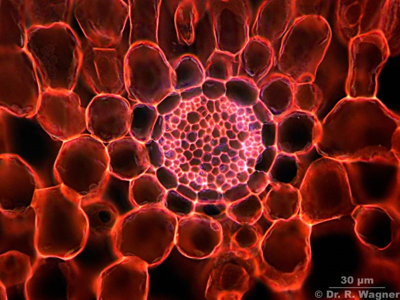 zur Vorbereitung des nächsten Mikroskopierabends des NWV Wuppertel ( https://www.mikroskopie-forum.de/index.php?topic=9800.0 ) habe ich schon mal ein wenig geübt. Übungsobjekt war der gemeine Tannenwedel aus meinem Gartenteich. Nach Fixierung in AFE wurde der Stengel in Holundermark eingebettet und mit meinen Jung Studentenmikrotom geschnitten, alles 30 µm. Gefärbt wurde anschließend mit FCA von Chroma, und mikroskopiert einfach in Wasser. Wasser deshalb, weil mir beim Entwässern in Isopropanol die Schnitte verkräuselten und sich somit kein gescheites Dauerpräparat in Euparal herstellen ließ.