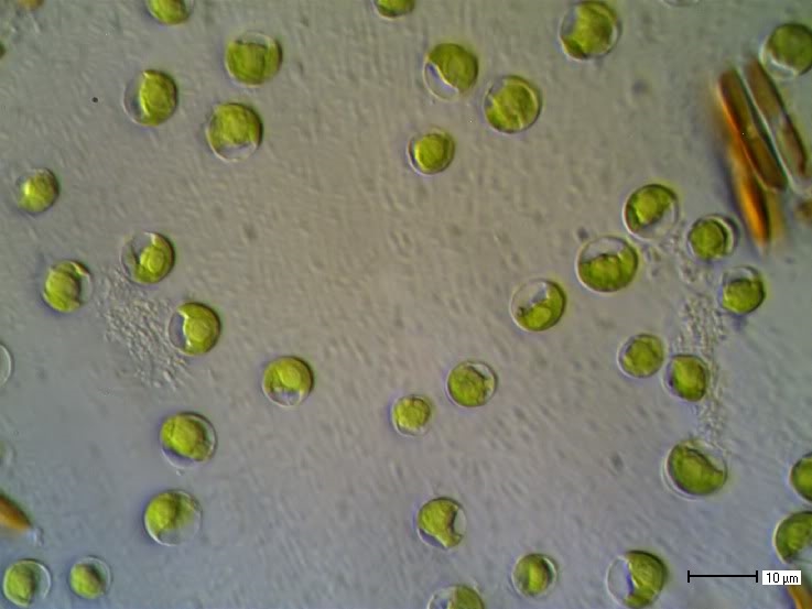 Ich vermute mal, es handelt sich bei den ca. 8 µm großen Grünalgen um eine Salzwasser-Chlorella an Bakerienrasen (ca. 3µmx1µm grosse Stäbchen)