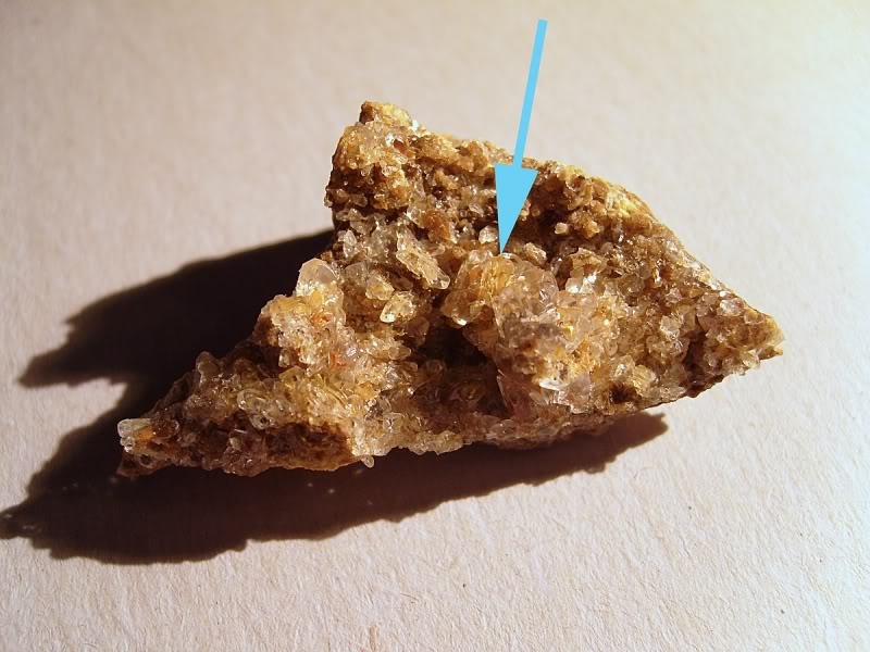 ich hänge noch ein Bild der kleinen Calcit-Stufe an. Der Pfeil zeigt mit der Spitze genau auf den Phantomkristall.