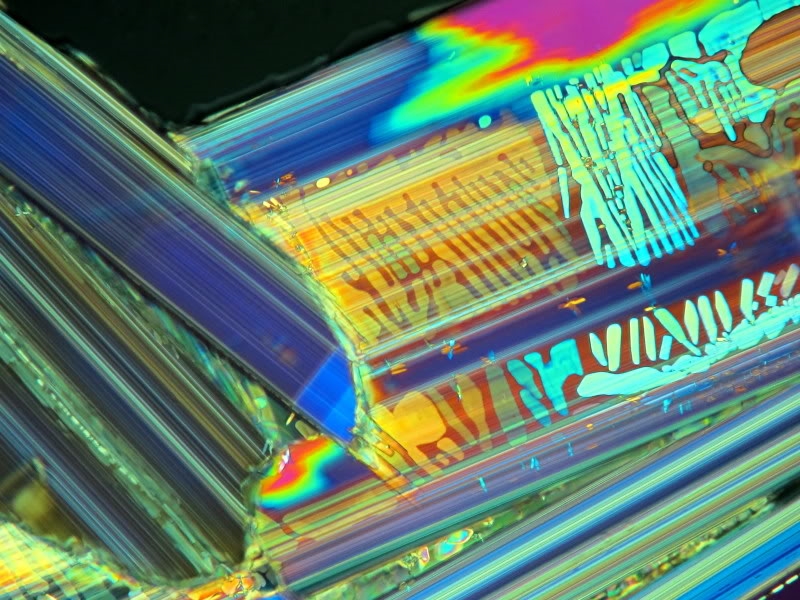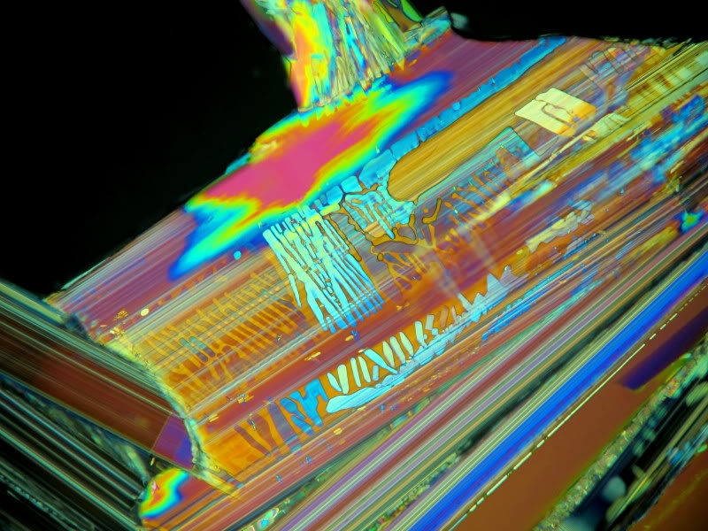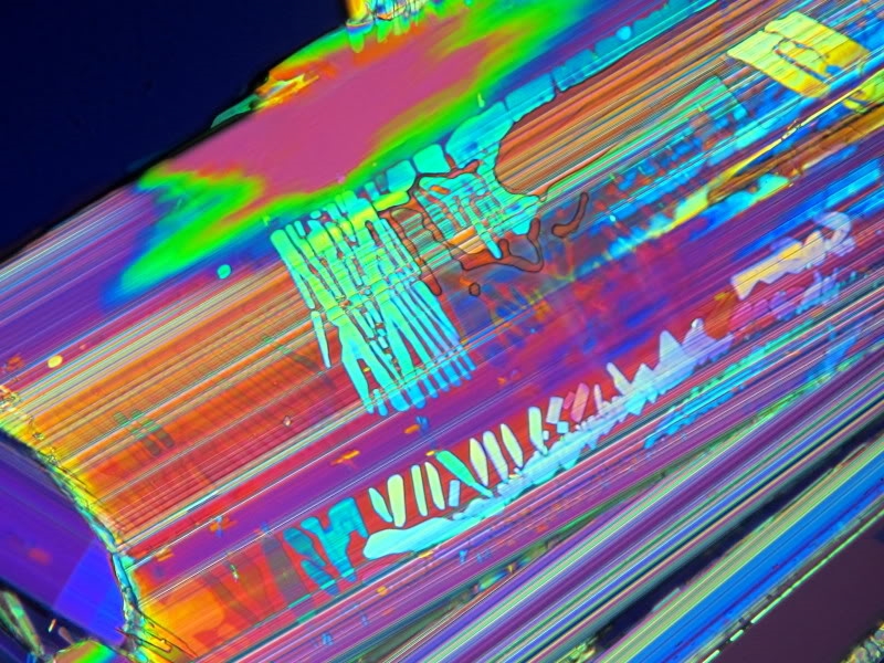 Hier fand ich eine reizvolle Ecke mit eigenartigen Strukturen und ganz feinen parallel laufenden Kristallen, die durch unterschiedliche Orientierung gut unterscheidbar sind: