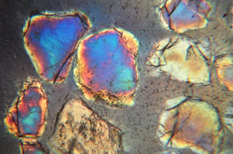 Hier zwei Fotos im polarisierten Licht, gekreuzte Polarisatoren.