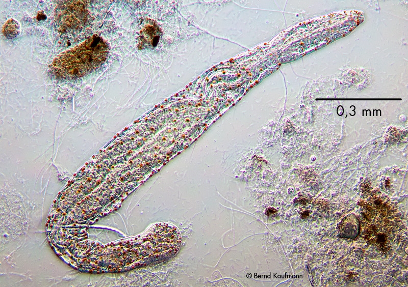 in derselben Probe fanden sich viele Wimpertierchen (Euplotes), Fadenwürmer und auch dieses Öltropfenwürmchen (Aeolosoma variegatum):