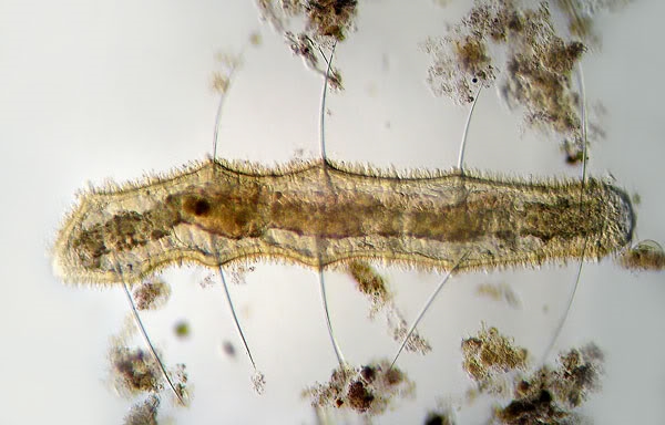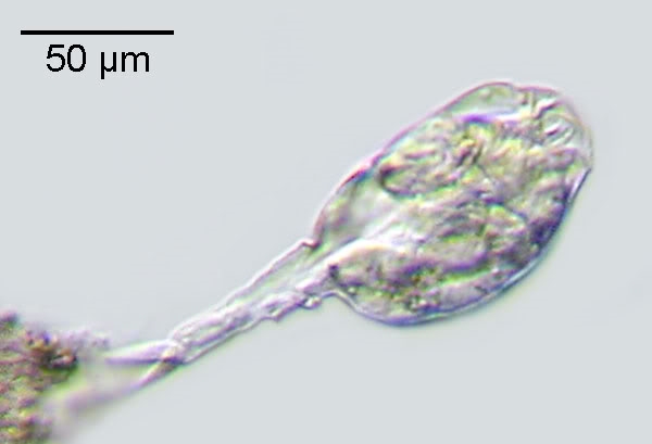 Das Rädertier sah ich heute in o.g. Probe dreimal, leider immer nur in dieser Perspektive und am Detritus verharrend. Das Tierchen bewegt sich nur auf und ab, "zittert" aber munter bzw. kippt ständig, deshalb die Unschärfe. Schwimmend konnte ich es nie sehen.