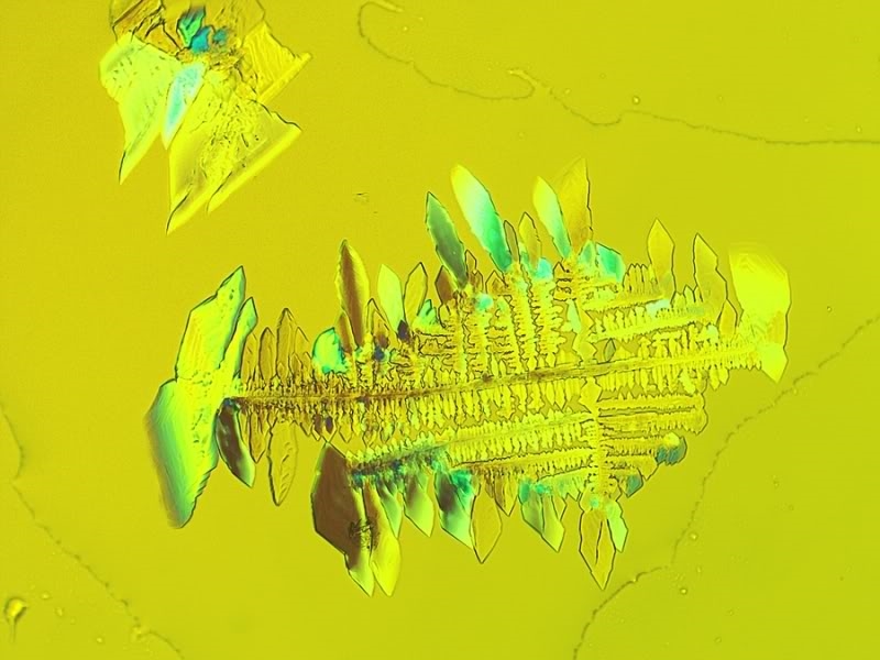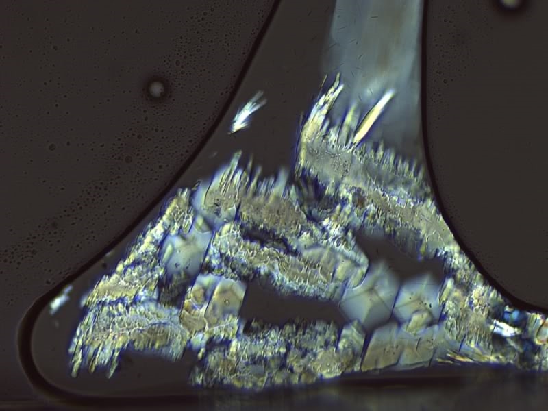 Diese hygroskopische Substanzmischung sorgt ja offenbar für ein wochenlanges Unterhaltungsprogramm. Ich muss an den Deckglasrand meiner Kristallpräparate immer wieder mal Wasser pipettieren, damit es neue Konfigurationen gibt.
