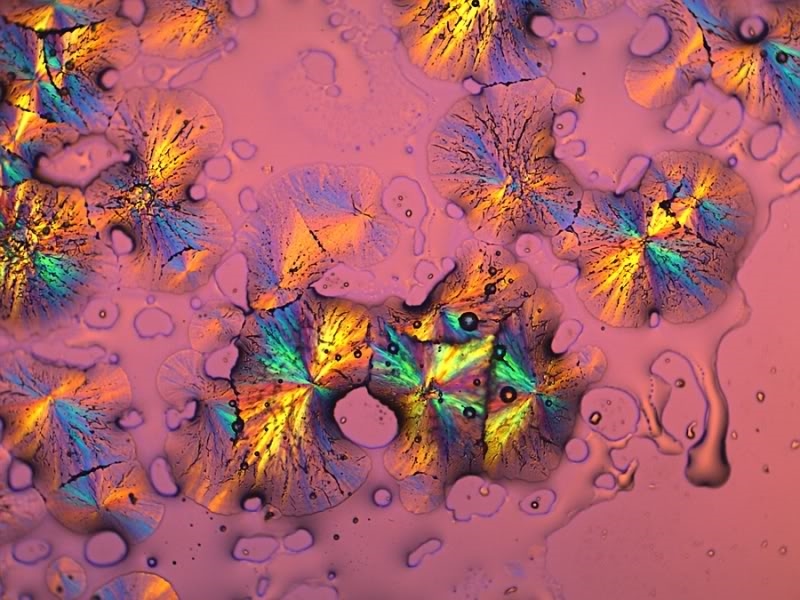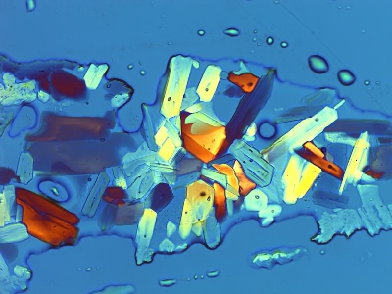 eine Mischung aus Natrium-Dihydrogenphosphat, Dinatriumphosphat und Natriumbenzoat habe ich mit Wasser verdünnt auskristallisieren lassen (teils unter Deckglas). Da diese Salze sehr hygroskopisch sind ergaben sich über einige Zeiten hin immer wieder neue Variationen: