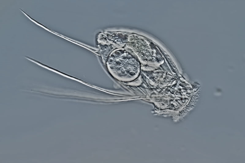 heute konnte ich mich über mein erstes Foto einer Filinia freuen. Wahrscheinlich handelt es sich (lt. Wassertropfen) um Filina longiseta var. passa, da die Borsten keine Dornen haben. Länge ca. 200 mü.