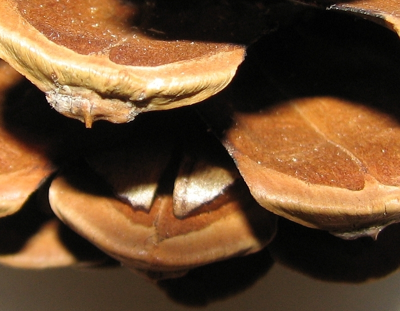 Die einzelnen Samen sitzen hier jeweils paarig auf den Schuppen des Zapfens.