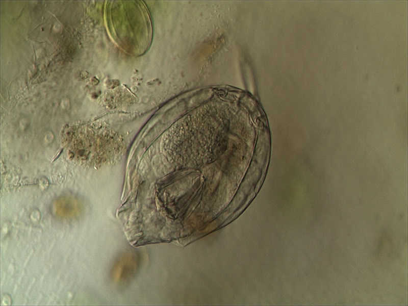 Links zu sehen ein Rädertier, aber bedeckt von einem großen Insektenflügel. >:(
