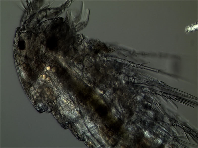 Ob es sich bei dem abgebildeten Individuum um einen "Lieferanten" des Segments handelt, ist nicht sicher. Allerdings ist der "Kamerad", wenn ich mich beim Zählen der Beinpaare nicht vertan habe, ein Copepode (Ruderfußkrebs). Vom abgebildeten Habitus her tippe ich mal auf einen Angehörigen der Harpacticoida. Eine Abbildung eines Artbeispiels findest Du im STREBELE / KRAUTER (Canthocamptus).