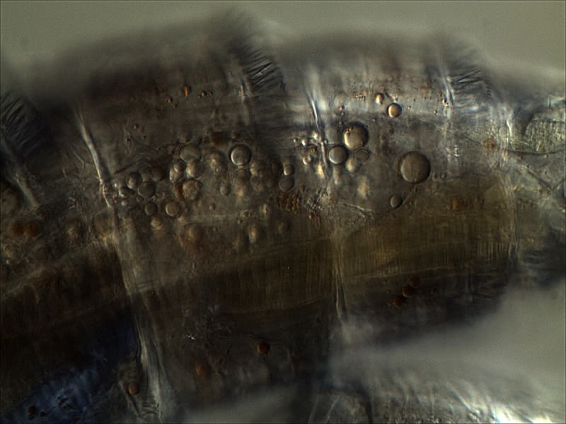 Jörgs Interpretation scheint mir ebenfalls am plausibelsten, das erste Bild zeigt ja auch einen geschlossenen Ring, wie man es bei Segment erwarten würde, auch die Oberflächenstruktur spricht dafür. Am Deckglasrand bin ich aber ebenfalls ratlos - wie groß ist das Objekt denn in etwa? Scheint aber nichts Lebendiges zu sein.
