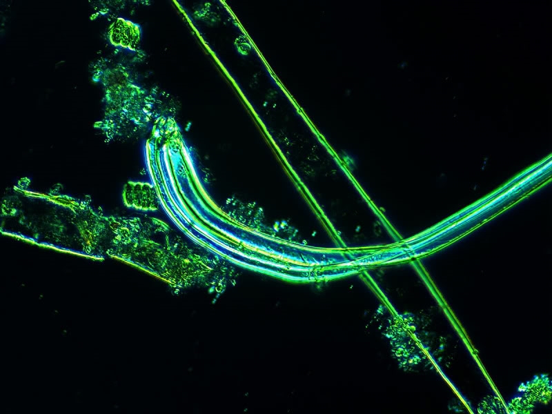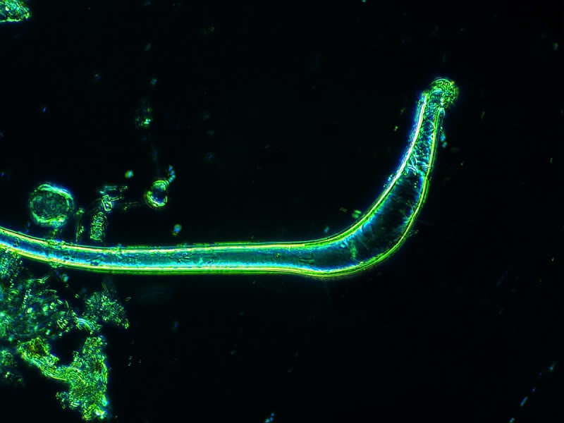 Solche Fäden habe ich in der Vergangenheit schon öfters in Tümpelproben gefunden, mich wohl auch mal drüber gewundert (der Schlenker am u-förmigen Anfang war mir jedesmal aufgefallen) sie aber nicht im pol. Licht betrachtet.