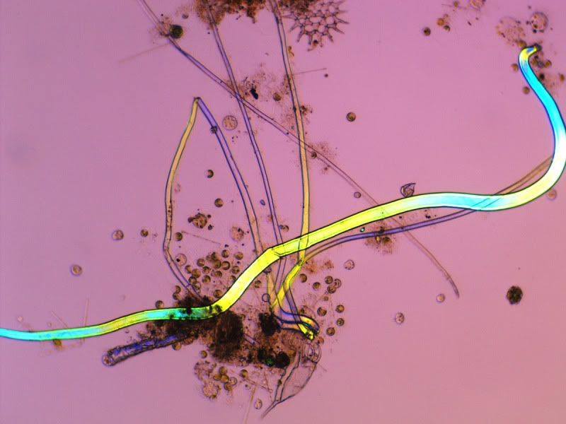 ob es sich um solche Fäden wie Du sie zeigst handelt weiß ich nicht. Ich vermute mal denn ich fand ebenfalls doppelbrechende Exemplare , allerdings ohne den unteren "Knollen".