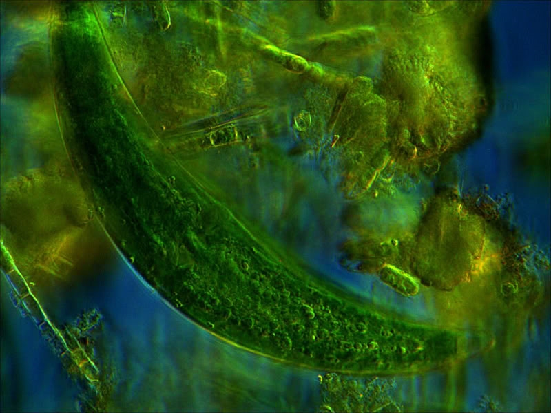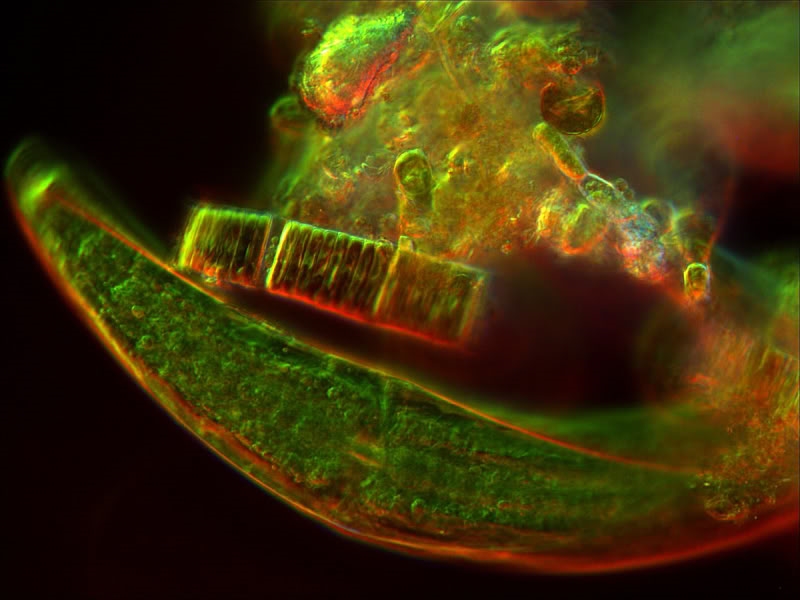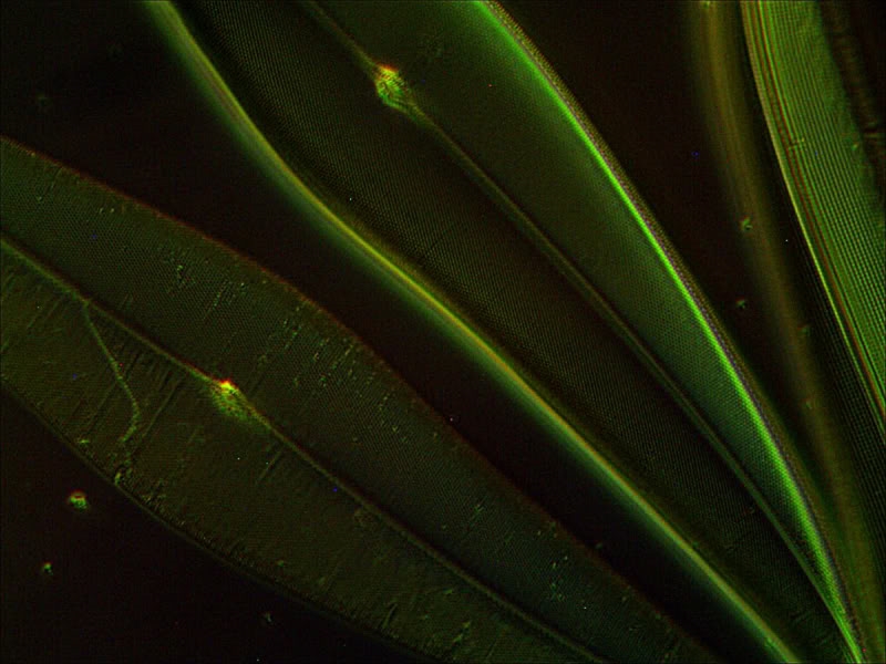 Hier eine Folienblende am mit grün-gelben Außensektoren am Diatomeenpräparat (Gyrosigma balticum):