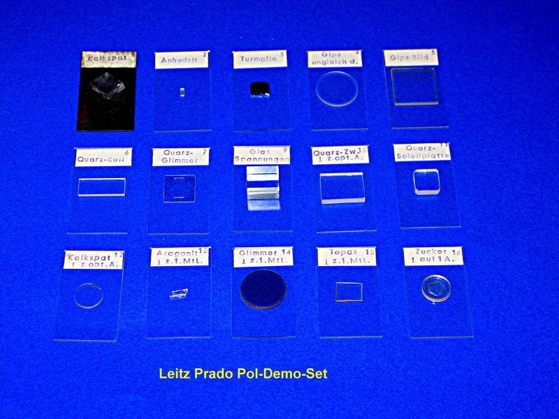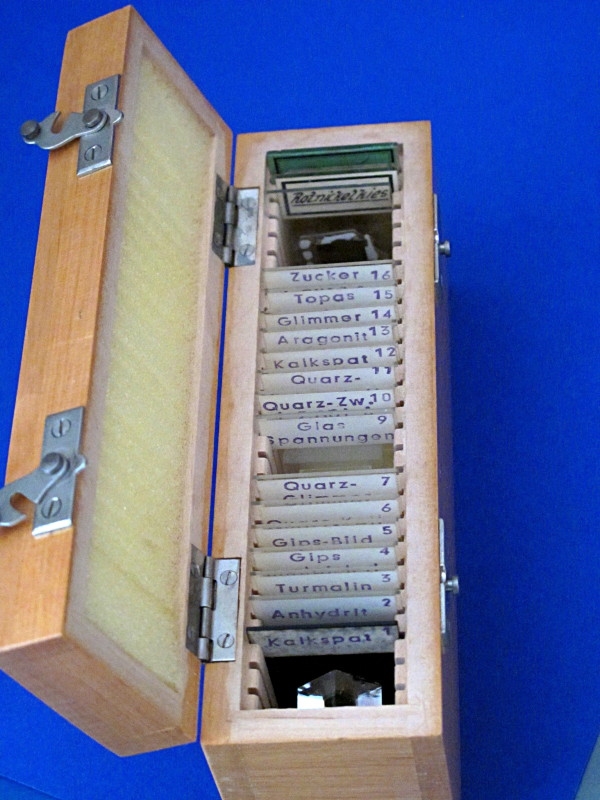das ganze Demo-Set ist in einem Holzkästchen. Die Glaspresse passt da nicht rein. Es sind hauptsächlich orientierte Dickschliffe. Das erste ist ein klarer Calcit-Spaltrhomboeder auf einem Metall Träger mit einen feinen Loch um die Doppelbrechung zu demonstrieren. Man sieht das Loch 2 mal, wenn man durch das Spaltstück durchschaut.