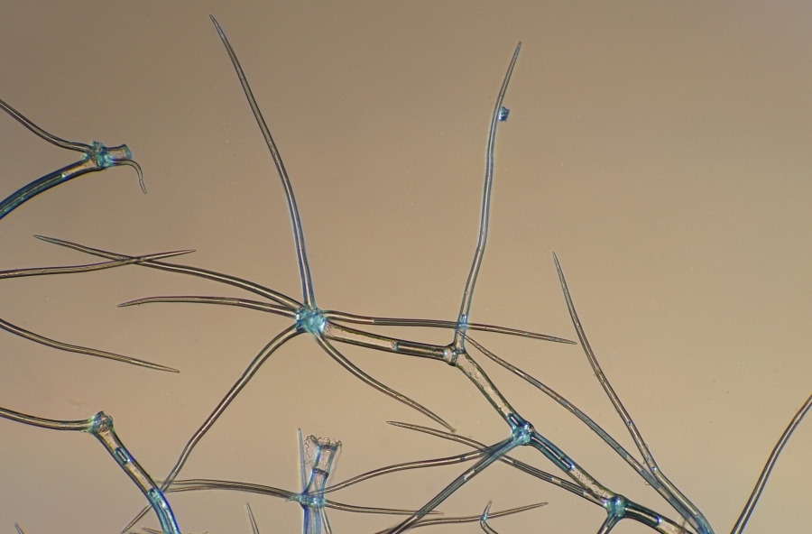 Verbascum spec. (Königskerze), Etagen-Sternhaare (korrekte Bezeichnung?), Durch- und Auflicht kombiniert (keine Pol.), 10er Objektiv, gestackt.