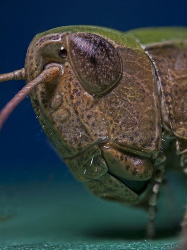 in letzter Zeit werden ja viele Makrofotos gezeigt, daher auch mal eines von mir, verbunden mit einer Frage: Was identifiziert ihr im Gesicht des Grashüpfers spontan als Augen? Dazu unten ein paar Sätze.
