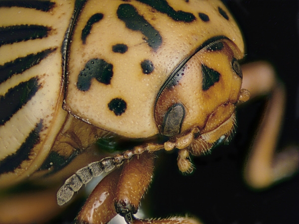 Lustig ist auch der Kartoffelkäfer: Hier sind die Augen so gut getarnt, dass sie sich gar nicht mehr in unsere Wahrnehmung drängen - man muss sie richtig suchen!