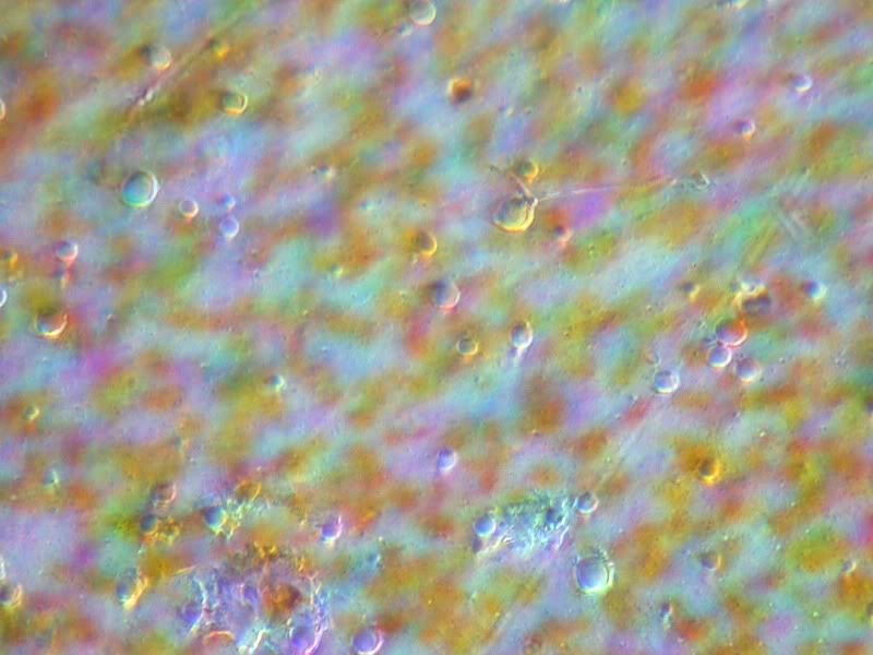 SO sieht das Korn beim Farbfilm (sw habe ich leider nicht mehr ) im Durchlicht bei 400-facher Vergrößerung und leicht gezoomt aus. Das zweite Bild ist stärker gezoomt und schief beleuchtet. Die auch hier sichtbaren "Pickel" (natürlich eindeutig der Schichtseite zuzuordnen) liegen auf jeden Fall in einer anderen Ebene als das Korn.
