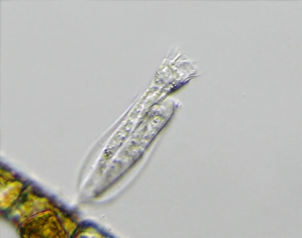 Und hier bin ich unsicher. Hätte das Gehäuse keinen Stiel und wäre alles größer, würde ich das folgende Pärchen für Vaginicola subcrystallina halten. Ich maß insgesamt gut 110 µm (davon das Gehäuse ca. 65 µm).