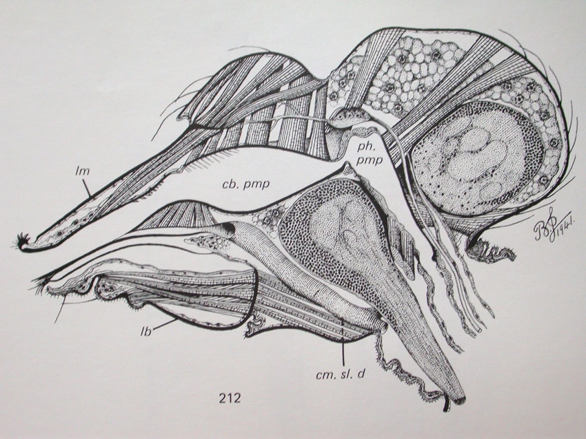 Die Zeichnung zeigt den Kopf einer Kriebelmücke im Sagittalschnitt. Der Nahrungsgang mit der Ciberalpumpe (cb.pmp) der Pharynxpumpe (ph.pmp) und der zugehörigen Muskulatur, der Speicheldrüsengang (cm.sl.d), das Oberschlund und Unterschlundganglion sowie das kleine Frontalganglion (vor dem Oberschlundganglion) mit seiner neuronalen Anbindung sind in ihrer Lage in dieser Übersichtszeichnung gut zu erkennen. Ich vermute: Es handelt sich nicht um die Zeichnung eines einzigen Präparates, sondern um eine zeichnerische Zusammenschau einiger verschiedener Präparate. Es wäre ein ausgesprochener Glücksfall, bei so einem kleinen Tierchen alle Organe so wohlgeordnet nebeneinander zu finden. Im gleichen Buch findet sich neben solchen Übersichtszeichnungen eine Fülle von minutiösen Detailzeichnungen einzelner Organe.