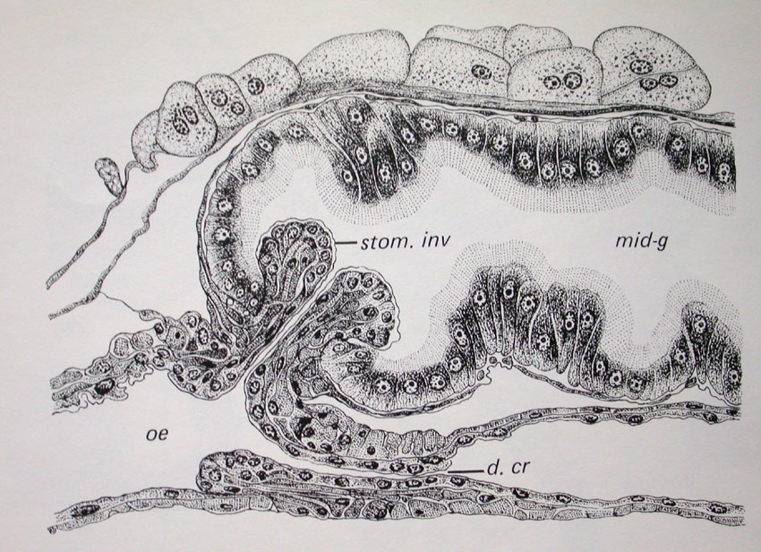 Gut erkennbar ist die Funktion der Valvula cardiaca: Ein Ventilsystem, dass den Rückfluss der Nahrung in den Oesophagus verhindert. Ebenso gut erkennbar ist der unterschiedliche histologische Befund von Kropf und Mitteldarm: Hier große Zellen mit großem Zellkern, die gleichzeitig der Sekretion und Resorption dienen, die Zellen mit einem oberflächenvergrößernden Rhabdorium versehen. Dort ein dünnwandiges Häutchen, im inneren mit einer hauchdünnen chitinösen Schicht belegt: Der Kropf dient nur als sicherer, dichter, vorläufiger Aufbewahrungsbehälter, der sich bei Simulium bis tief in das Abdomen erstreckt und bei der Blutmahlzeit groß anschwillt.