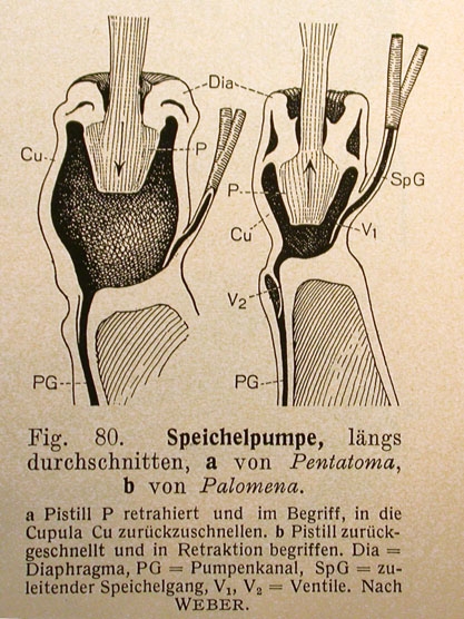 Die gezeigte Zeichnung ist vielleicht aus verschiedensten Gründen nicht repräsentabel für ihn. Ich habe sie dennoch, nachdem ich heute auf sie gestoßen bin,  gewählt, weil sie jedem technisch Interessierten sofort einleuchtend machen wird, wie so eine Speichelpumpe funktioniert, die z.B. den Speichel der Mücke aus dem paarigen Speicheldrüsen über den Speichelgang in uns injizieren könnte.