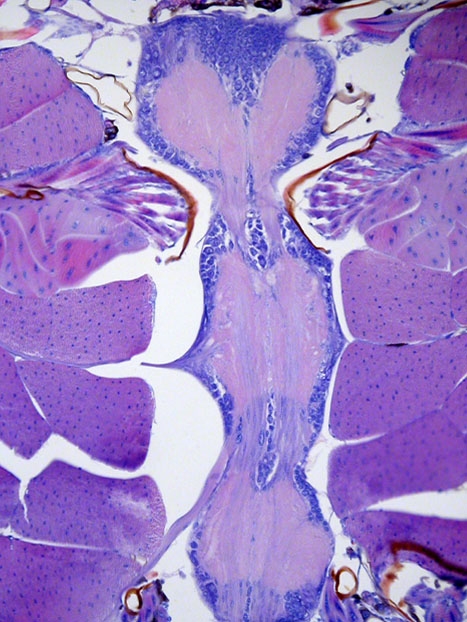 Von oben nach unten jeweils in der Mitte das Prothorax-, Mesothorax- und Metathoraxganglion. Den prinzipiellen paarigen Aufbau der Ganglien kann man - meine ich - an den jeweils paarigen neuronalen Verbindungssträngen zwischen den Ganglienknoten hier noch gut erkennen. Das Insekt würde mit den durch die innervierten sechs Beinen im Bild nach oben laufen. Rechts und links neben den Ganglien Flugmuskulatur.