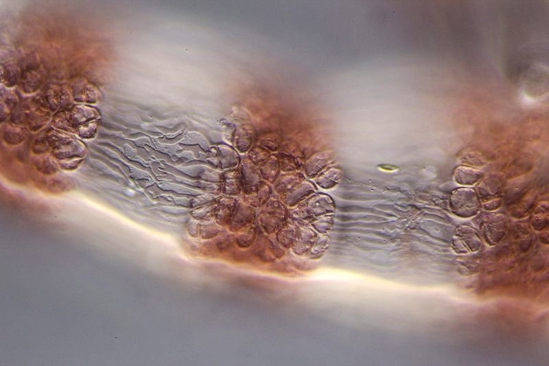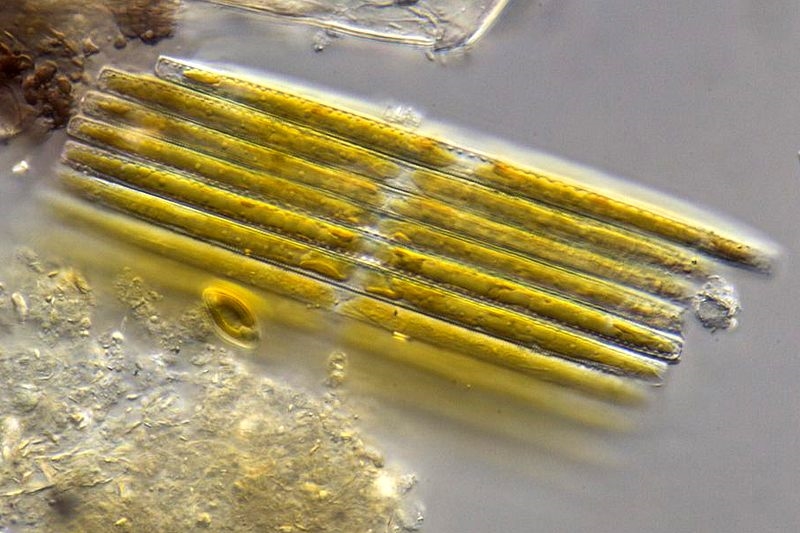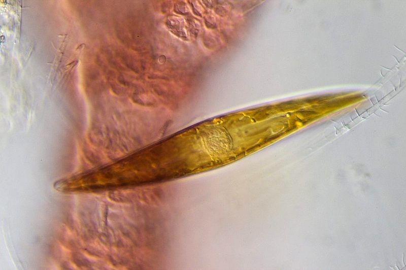 Die Diatomee Gyrosigma, die Rotalge Ceramium diaphanum, nochmal eine Diatomee, Bacillaria paxillifer (früher B. paradoxa),