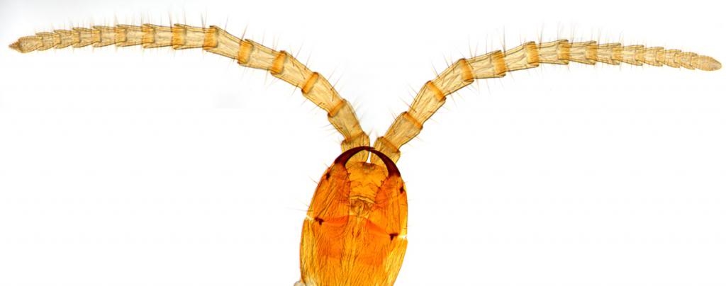 Es zeigt ein Kopf von einem juv. Hunderfüsser. Die Weite der beiden Fühlerspitzen beträgt ca. 6mm.