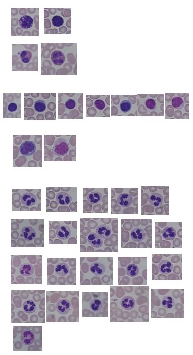 (1. Reihe: Basophile, 2. Reihe: Eosinophile, 3. Reihe: Lymphozyten?, 4. Reihe: Monozyten, Rest: Neutrophile)
