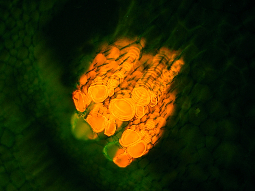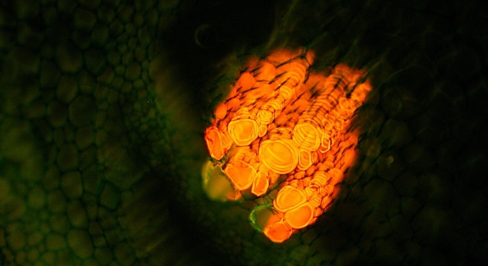 wieder mal ein Beispiel wie ein misslungener Schnitt in AL Fluoreszenz doch noch interessante Einblicke geben kann. Bei einem schief angeschnittenem Schnitt durch den Stängel eines Weihnachtssternes lagen die Tracheen des Xylems flach fast wie in einem Längsschnitt. Der Wacker W 3A gefärbte Schnitt zeigt die Tracheen bei Blauanregung in voller Pracht