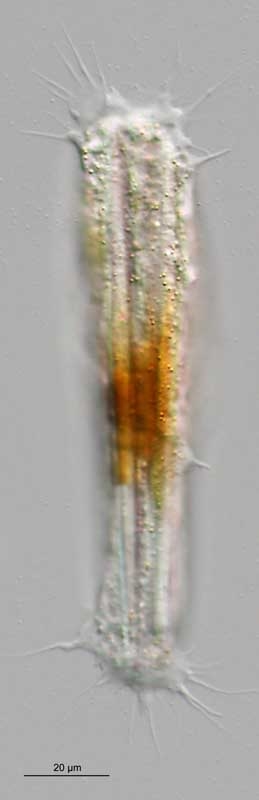 Auf den ersten Blick sieht die hier gezeigte Amöbe Vampyrella ähnlich, aber ihre Ernährungsweise und ihre Verdauungszysten unterscheiden sich grundlegend von Vampyrella. Möglicherweise handelt es sich um Filamoeba nolandi, die im alten Forum einmal von Wolfgang Bettighofer gezeigt wurde (http://www.mikroskopie.de/mikforum/read.php?2,38520,38520). Mangels geeigneter Bestimmungsliteratur ist das aber nur eine vage Vermutung. Vielleicht ist ja einer der Amöbenexperten hier im Forum an Hand der Fotos in der Lage zu sagen, welche Amöbe die Verdauungszysten gebildet hat.