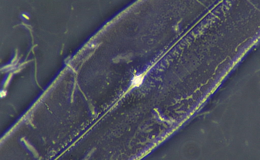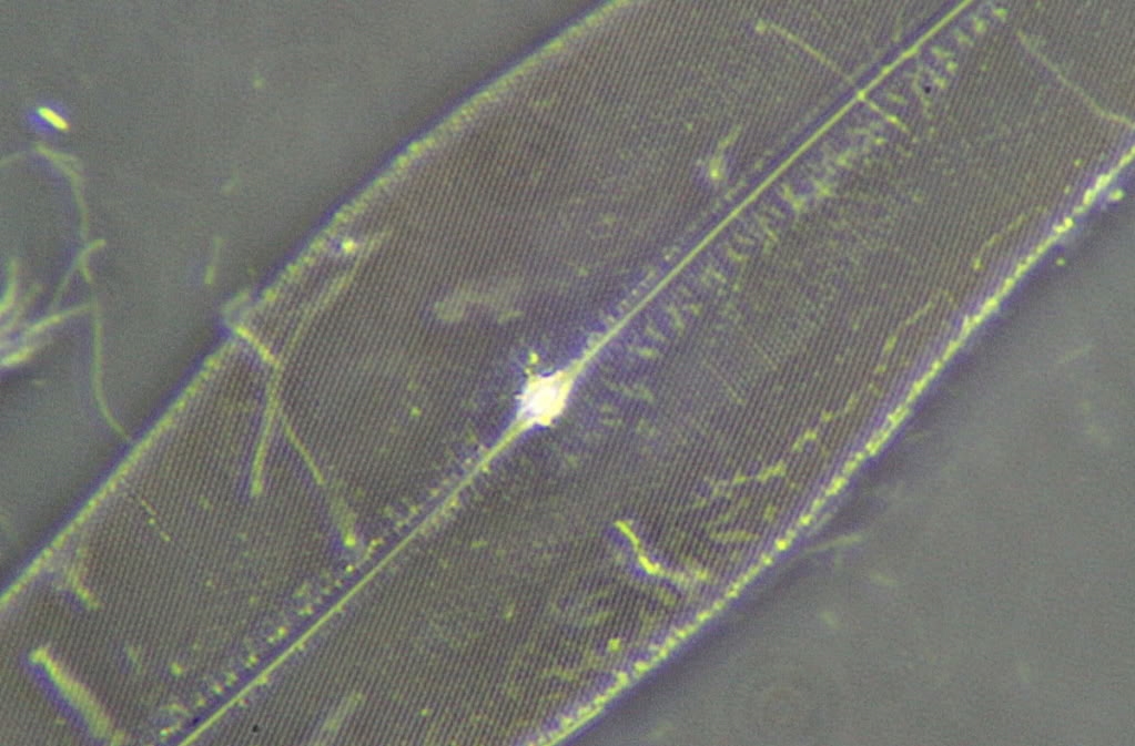 Nebenbei: Natürlich verwendet man den (normalen) Phasenkontrast im allgemeinen nicht, um bei Diatomeenschalen Feinstrukturuntersuchungen zu machen. Das bringt nichts. Ich verwende ihn aber trotzdem oft bei relativ niedrigen Vergrößerungen (mit dem 16er Objektiv). Dort hat man einen fast dunkelfeldähnlichen Kontrast, der erstens schön ausschaut und zweitens das Auffinden bestimmter Objekte erleichtet.