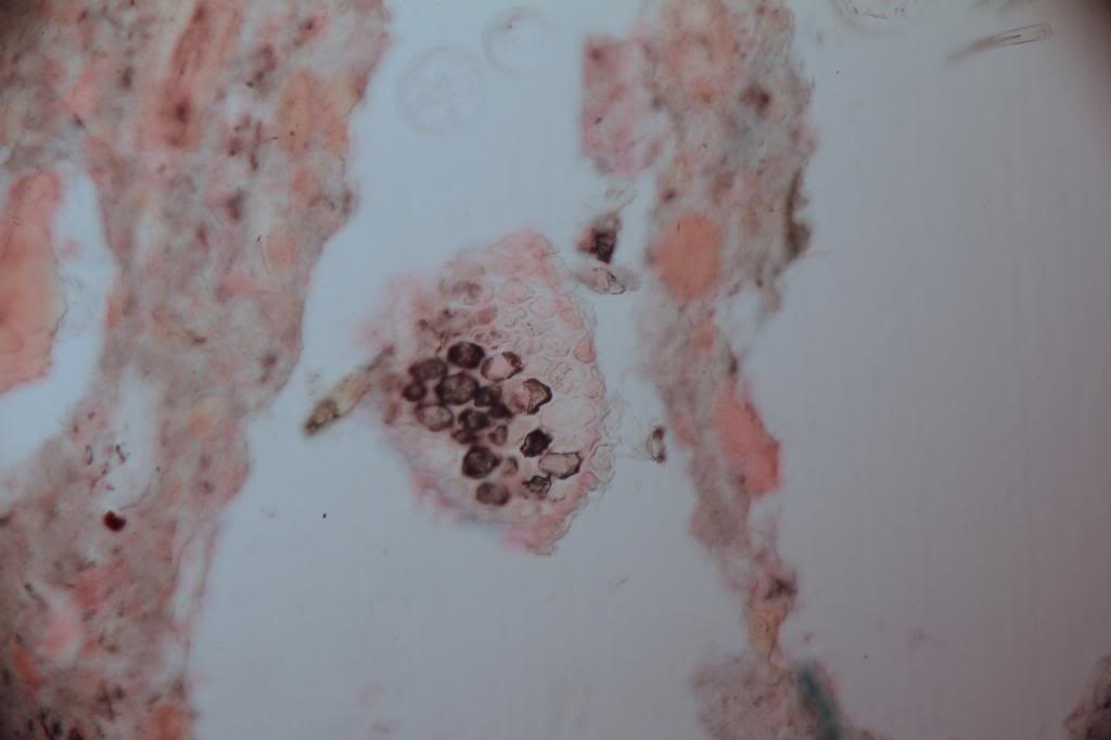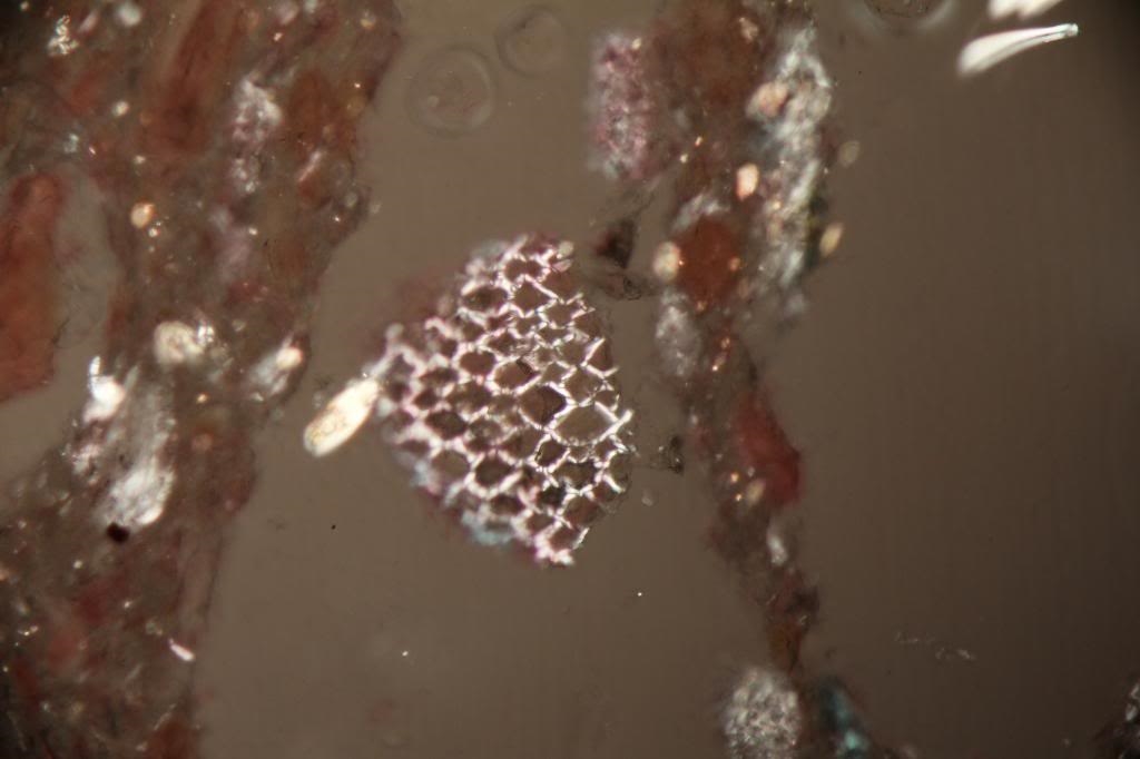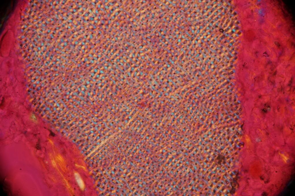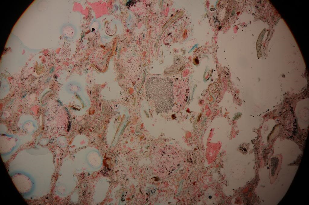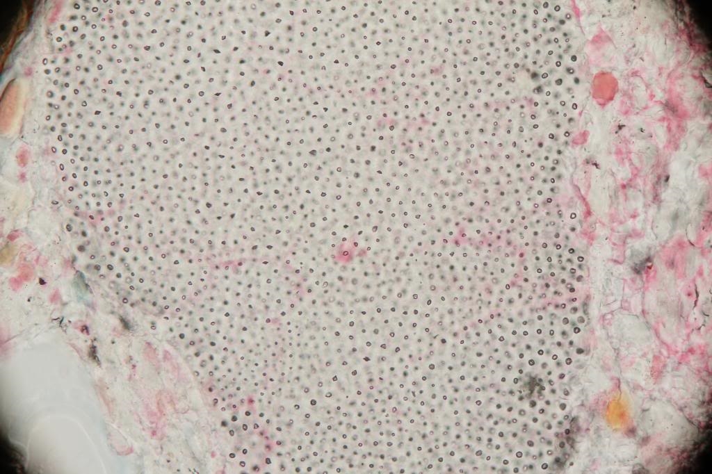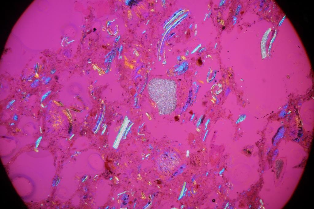 Heute habe ich (was auch anderes) einen Dünnschliff angefertigt. Ich verwendete dazu ein Objekt aus unserem Haushalt. Habe die Probe angeschliffen, die Anschliff-Fläche mit UV-Kleber gertränkt, ausgehärtet und nachgeschliffen. Dann mit UV-Kleber auf Objektträger aufgeklebt und dünngeschliffen. Nach Färbung mit May-Grünwaldlösung mittels UV-Kleber ein Deckglas aufgebracht.