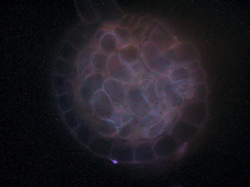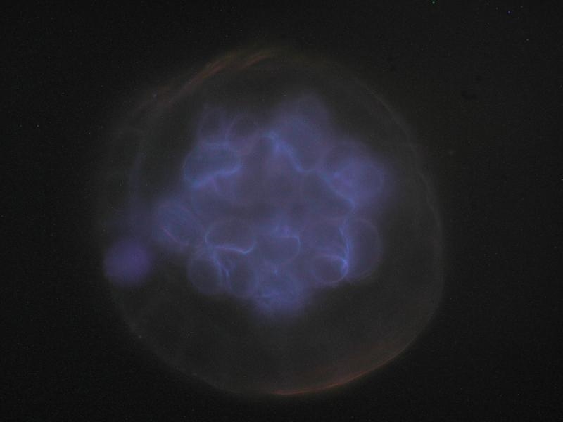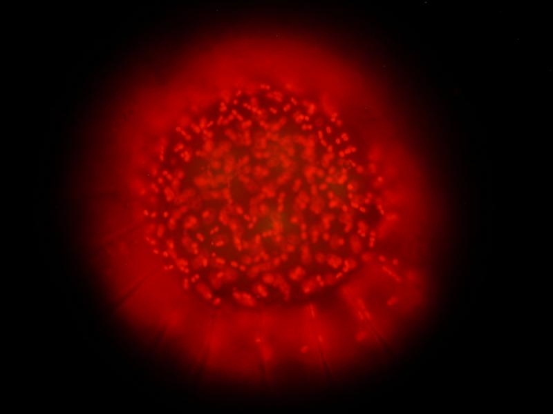 Bei UV Anregung mit 365nm (Sperrfilter 430nm) zeigen die Sporen selber blaue Fluoreszenz. Der Effekt ist sehr schwach und bringt die Coolpix bei Belichtungszeiten von 4" bzw 8" an ihre Rauschgrenze. Aber es geht ja hier nicht um schöne Fotos, sondern um den Nachweis der Fluoreszenz