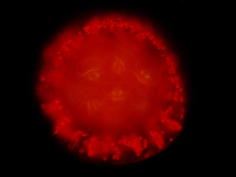 Bei Anregung mit 470nm zeigen sich die zahlreichen Chloroplasten in der Sporenkapsel