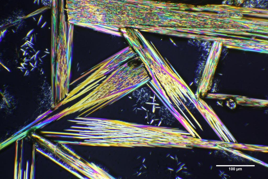 die Experten werden es sicher sofort sehen? Das erste Bild zeigt was sich sublimiert hat am gegenüberliegenden Objektträger (x16, POL), zwei und drei das was sich an der Ursprungssubstanz abgesetzt hat im Auflicht...