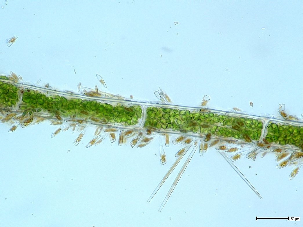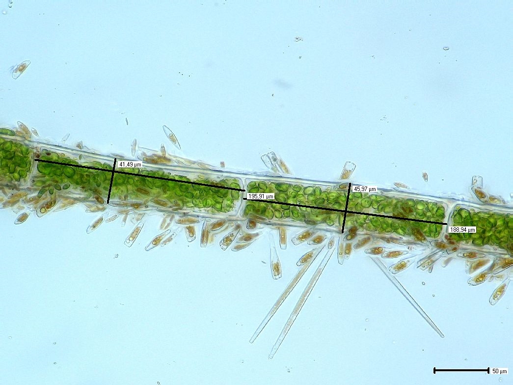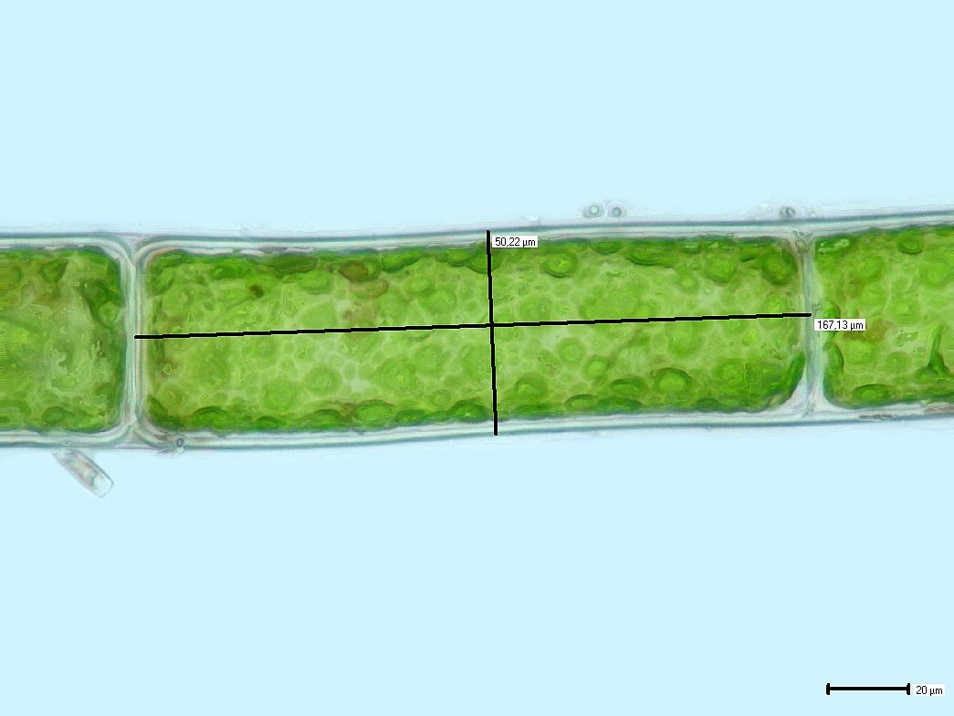 Möglich wäre aus meiner Sicht auch noch die Bündel-Grünalge (Rhizoclonium hieroglyphicum), ich habe aber auch keinerlei Zweige gesehen. Die Zellgrößen sind in den Bildern unten angegeben.