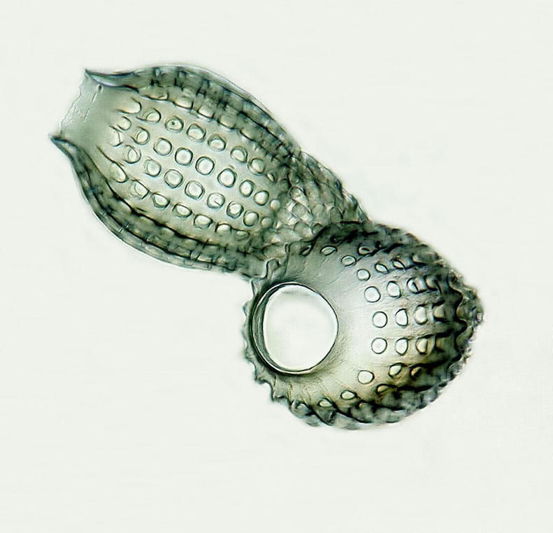 nicht immer liegen die Objekte schön plan, manchmal sind sie sogar gestapelt. Ich habe trotzdem mal versucht, fotografisch in die verschiedenen Ebenen zu gelangen und den Stapel dann digital zu stapeln... Hier zwei Radiolarien aus meinem alten Schuchardt-Präparat, die doch schon ganz schön verquer lagen. 14 Aufnahmen haben scheinbar genügt, um ein einigermaßen brauchbares Ergebnis zu erzielen.