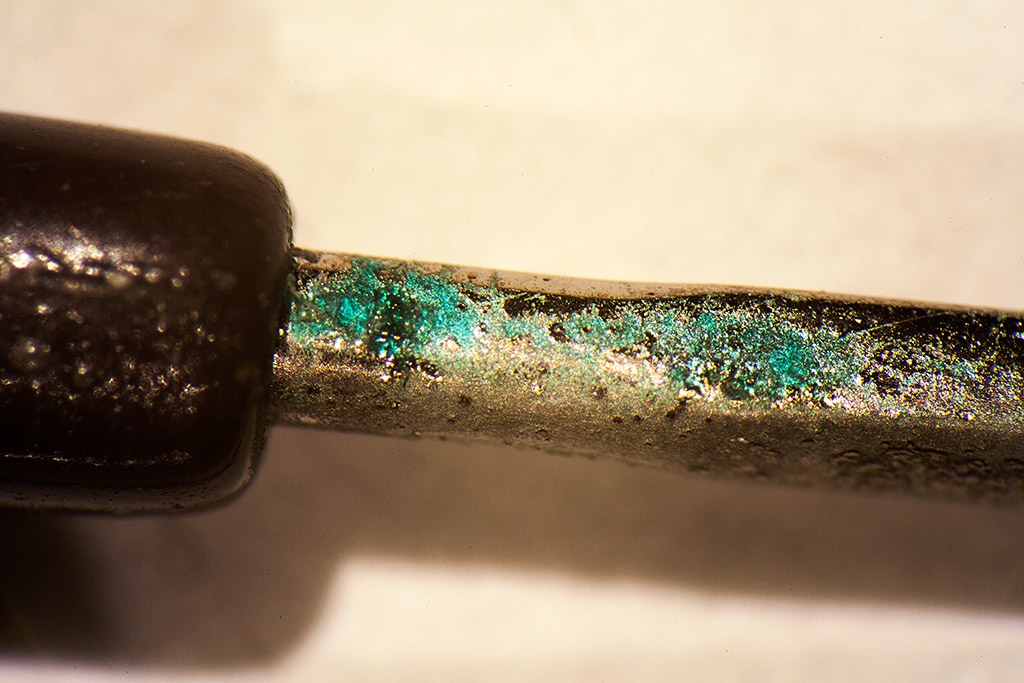 Grünspan (Kupfer-Azetat) ist an älteren Brillen eine häufige Erscheinung, aber es gibt noch eine ganze Menge anderer Kupfersalze, die sich durch ein ansprechendes Blau auszeichnen.