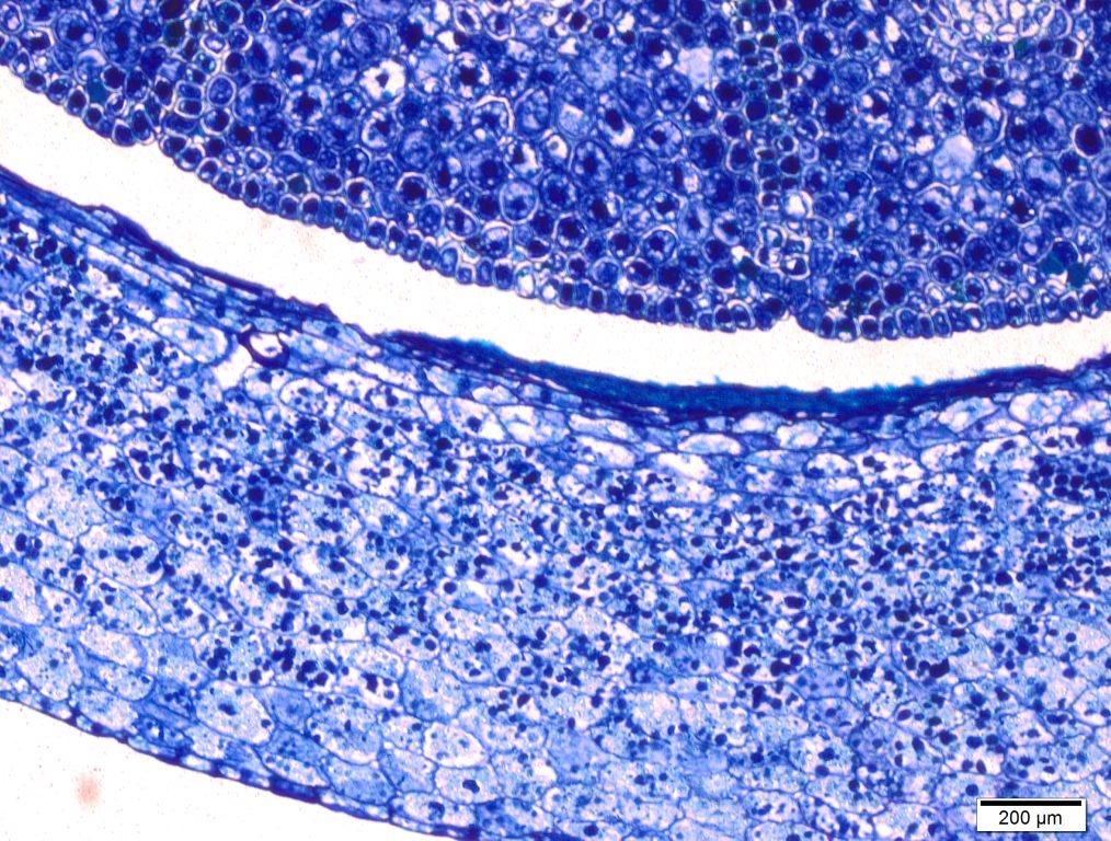 Sooo.. hier nun meine Fragen. Ich schreibe meine Bachelor-Arbeit über histologische Untersuchungen an Pinus pinaster. Ich habe vom Samen bis 14-Tage alten Keimlingen alles mithilfe einer Paraffineinbettung geschnitten und anschließend mit 4 verschiedenen Färbungen (Wacker, Methylenblau/Lugol´sche Lösung, FCA, Ponceau-Azur II) gefärbt, um nähere Informationen über Erscheinungsbild, Veränderungen während der Keimung und Zellinhaltsstoffen zu bekommen. Ich bin jetzt mitten in meiner Auswertung und könnte etwas Hilfe gebrauchen. Ich finde meine Wacker-Färbungen toll, vorallem wenn man sie mit meinen anderen Schnitten vergleicht, denn man sieht echt super viel. Doch so manche Farbresultate stimmen nicht ganz mit dem überein was Wacker sagt. Daher will ich gar nicht zu viel darüber schreiben was ich so denke, sondern vielleicht will sich der ein oder andere ja mal meine Bilder ansehen und mir mal sagen was er/ sie so darüber denkt. Kann es auch sein das z.b. meine Fixierung bzw die Einbettung dafür verantwortlich ist, dass die Farben etwas anders ausfallen?