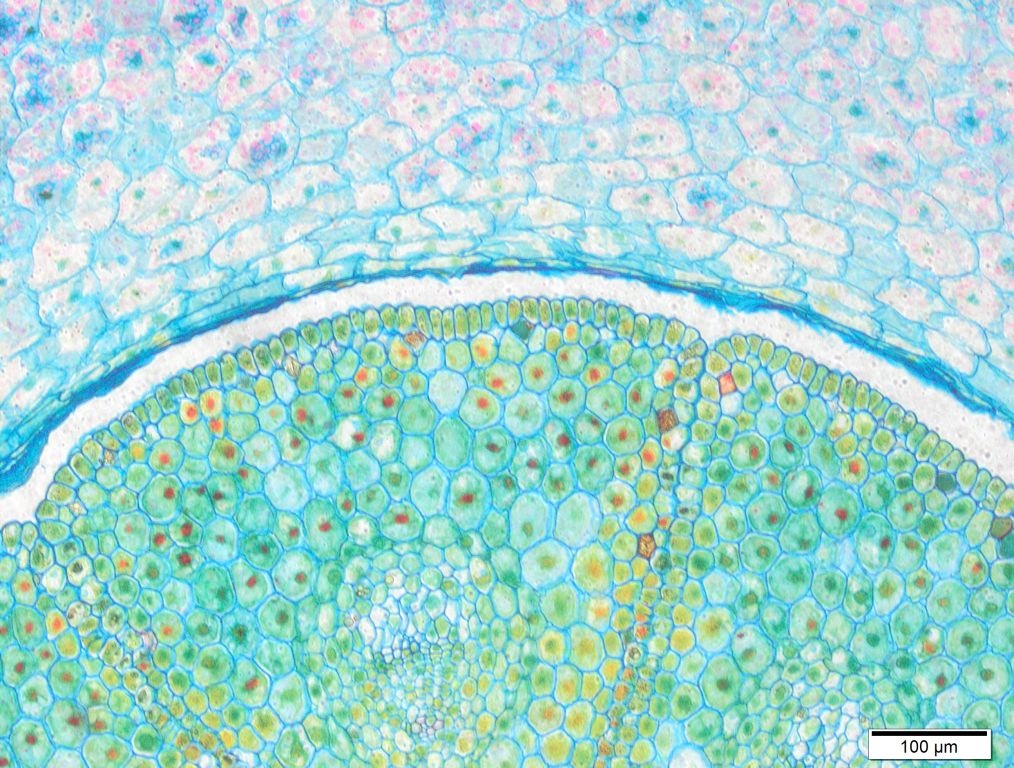 Auch bei meinen Präparaten zieht das Rot besonders bei "schwierigen" Geweben schon mal etwas mehr aus, als ich das gerne hätte und junges Xylem gehört definitiv in die Katergorie "schwierig".