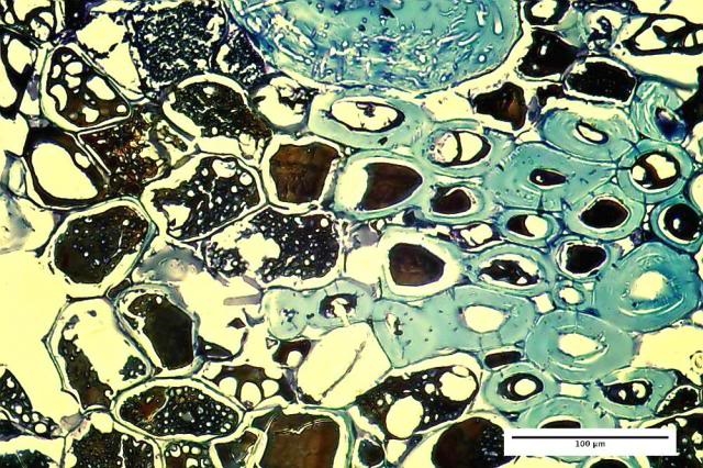 Crystalline cellulose is double breaking and can be made visible in polarized light. The picture shows the presence of crystalline material along the wall of the pores, rather suggestive of cellulose enforcement of the pore structure. It cannot be excluded however that  these big crystals were linked to the pore wall after sectioning and are not representing the thick walled hyphae.