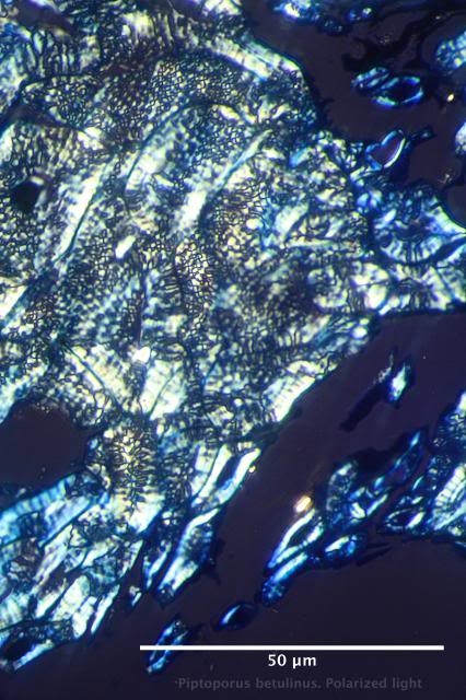 Piptoporus is a brown rotter because it degrades cellulose and leaves lignin almost intact causing the wood of the infected Birch to gradually turn brown. Crystalline cellulose is rather resistant to the hydrolytic action of Piptoporus (Valaskova & Baldrian, 2006). In the stipe by which the mushroom is connected to the host tree, I found pieces of the bark, like the sclereids shown here. The structure of the sclereids seems strongly affected by the hydrolytic action of Piptoporus enzymes . The image made of the same slide using polarized light shows the presence of double-breaking crystals . These crystals could be derived from the crystalline cellulose of the degraded sclereids. Higher magnification   under polarized light showed fracturing of the sclereid structure .