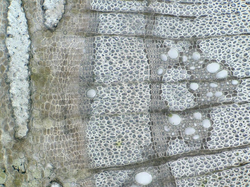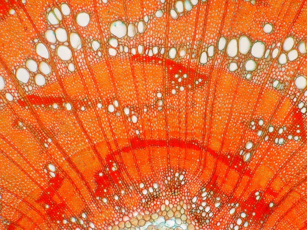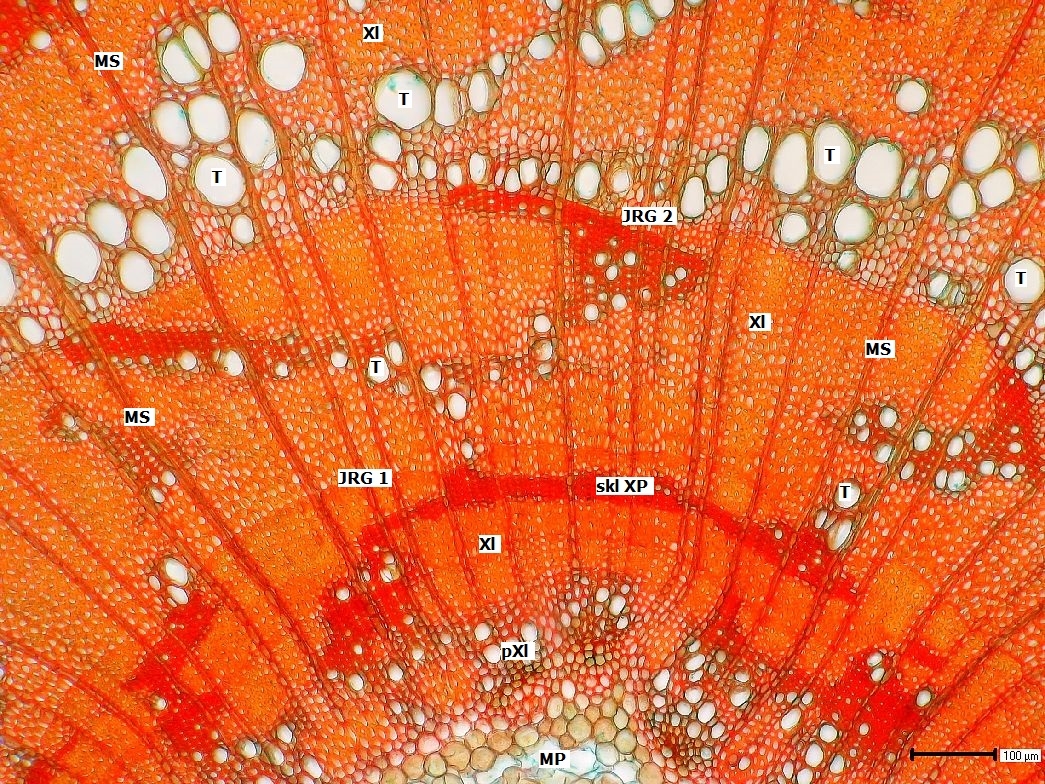 Hier wird noch einmal deutlich, dass die aktiven Elemente des Phloems (Siebröhren und Geleitzellen) in recht geringer Anzahl im umgebenden Phloemparenchym eingebettet sind. Immer wieder unterbrochen von Sklerenchym-Inseln. Im Xylem-Teil zeigen sich wieder die rot gefärbten Bänder stärker verholzten Xylemparenchyms, die sich deutlich von der Umgebung absetzen.