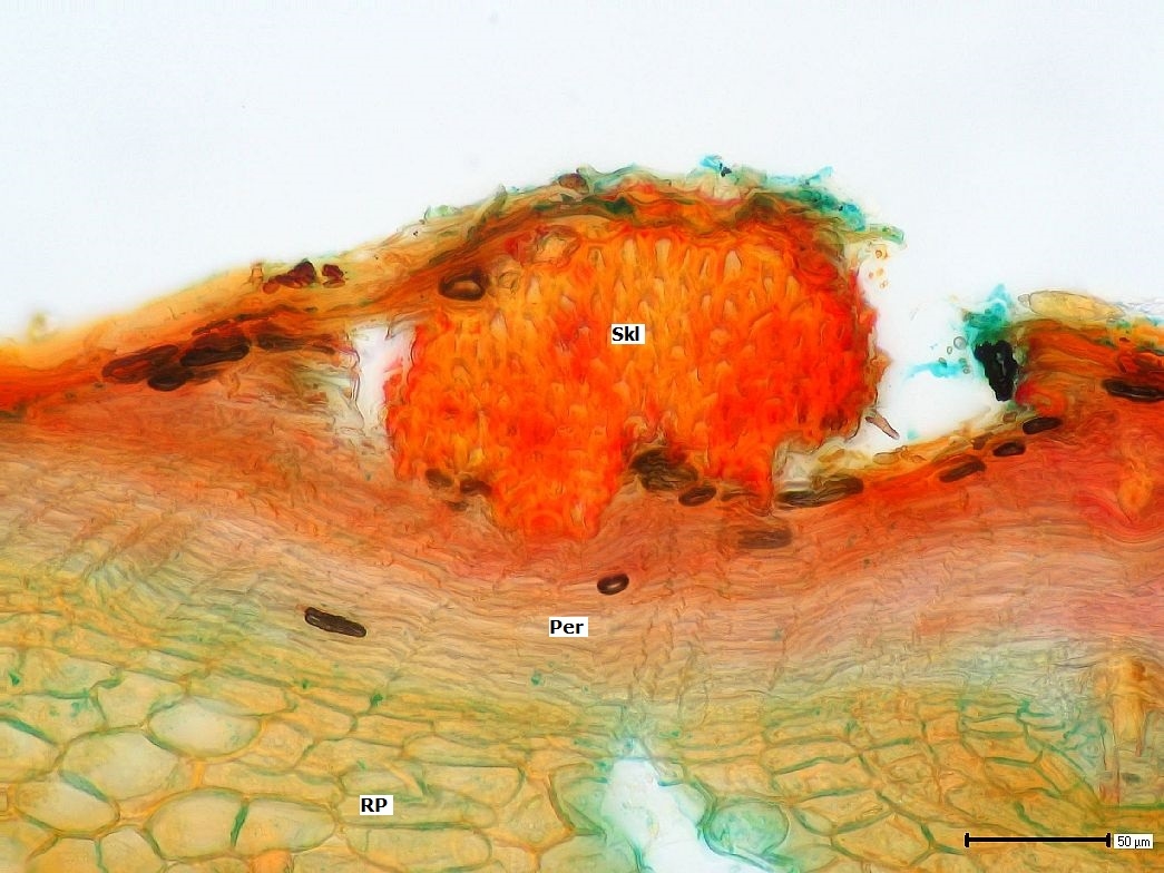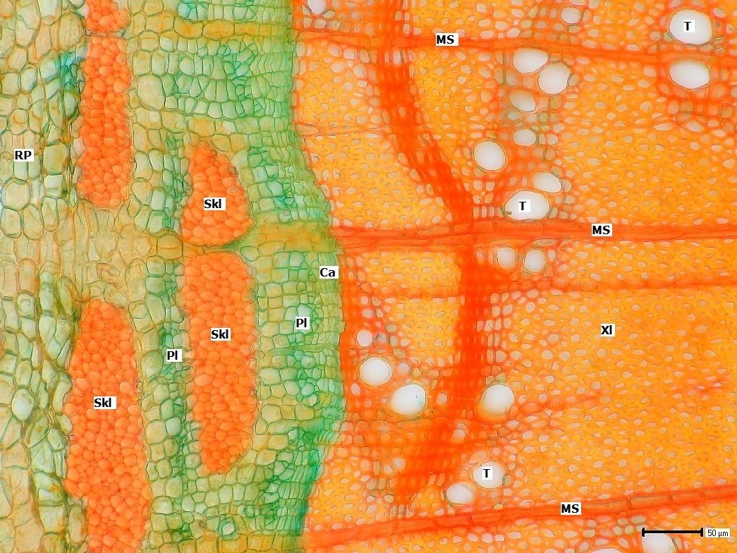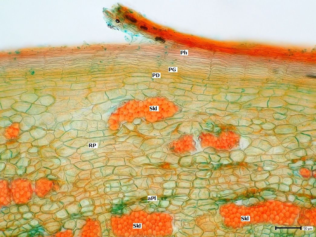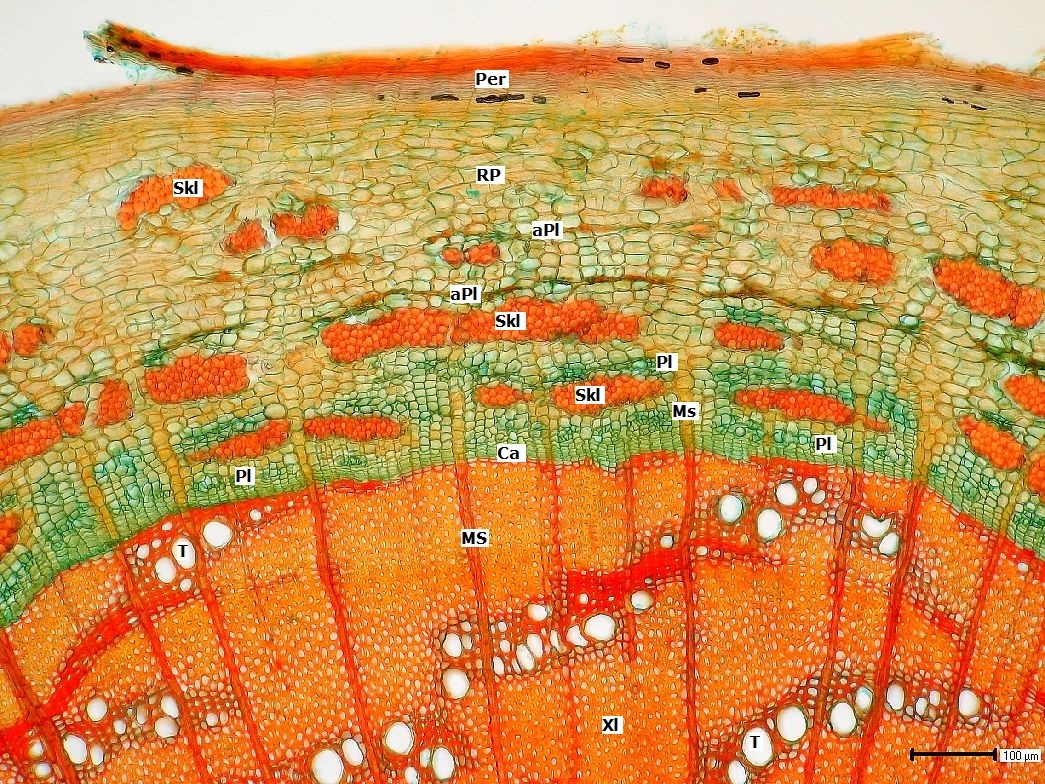 Auffällig sind die Sklerenchym-Inseln im Rindenparenchym und zwischen dem Phloem. Auch altes, zusammengeschobenes Phloem (aPl) ist erkennbar.