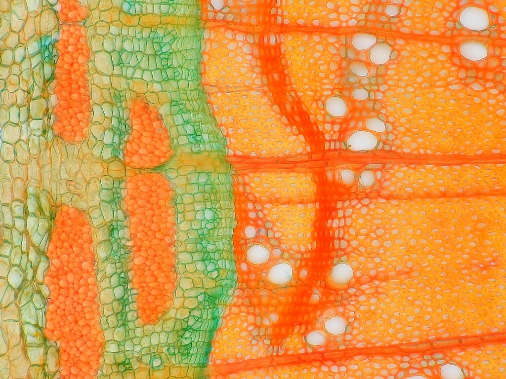 Man erkennt zwei Arten von Xylemparenchym, die sich durch einen unterschiedlichen Grad der Verholzung unterscheiden. Das rot gefärbte Gewebe ist dabei stärker verholzt wie das orange-gelbe.